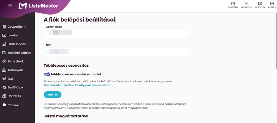- be szeretnéd kapcsolni vagy kikapcsolni a többlépcsős azonosítást (2FA) email-lel – ha bekapcsolod, az alfelhasználóknak is be kell állítani az email-címet, mert rájuk is érvényes lesz. Bővebben: Hogyan tudod beállítani a többlépcsős azonosítást (2FA)?