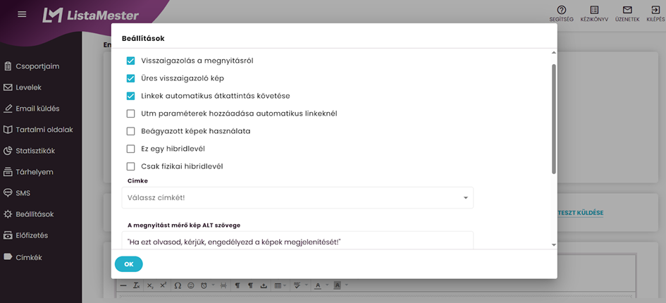 Visszaigazolás a megnyitásról: Ha ezt bepipálod, a rendszer nyomon követi, hogy a feliratkozóid megnyitják-e a levelet. Ajánlott minden levélnél bekapcsolni. Bővebben erről itt olvashatsz: Így állítsd be a visszaigazolást a megnyitásról