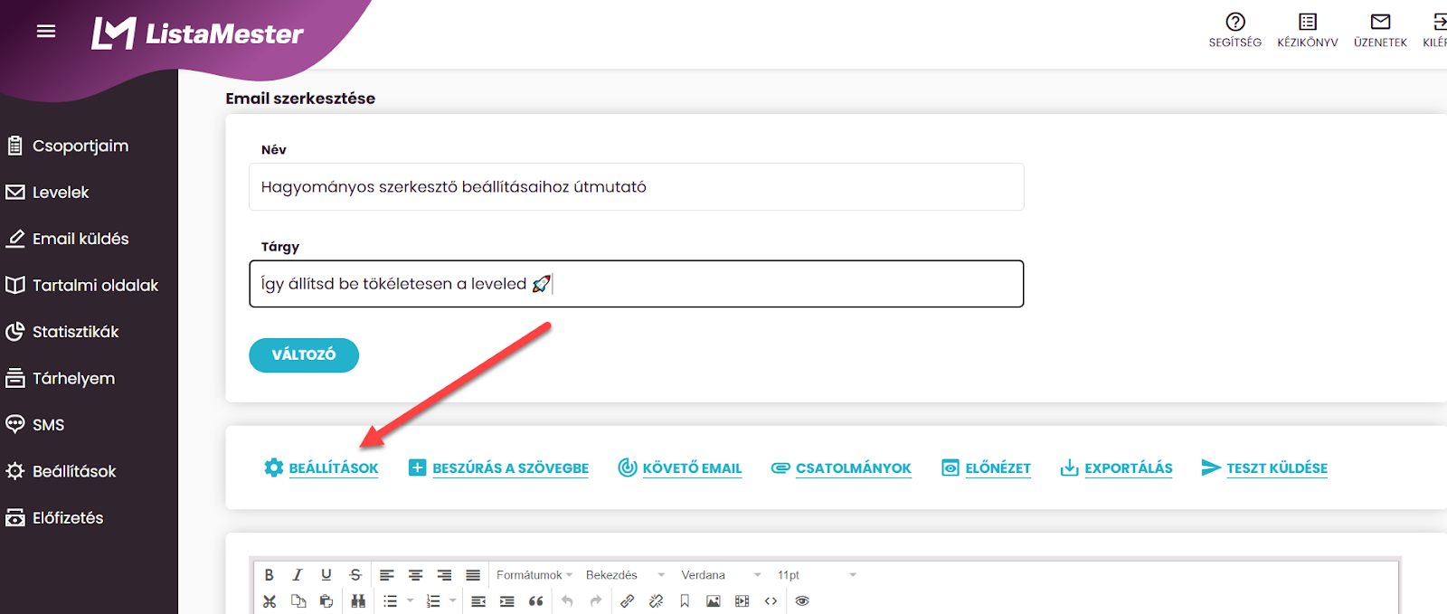 Miután létrehoztad az új levelet (megadtad a nevét, a tárgysort, kiválasztottad a hagyományos szerkesztőt és a sablont, majd kattintottál a Létrehozás gombra), megnyílik a levélszerkesztő. Itt a szerkesztőfelületen találod a Beállítások menüpontot, amelyre kattintva az alábbi opciókat tudod beállítani az adott levélhez: