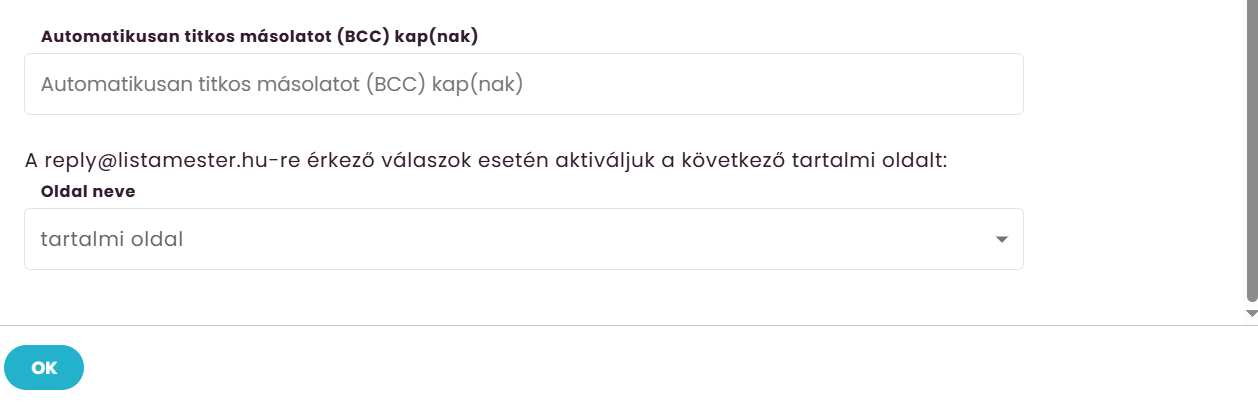 A reply@listamester.hu-re érkező válaszok esetén aktiváljuk a következő tartalmi oldalt: Ha a feliratkozód válaszol a leveledre, a rendszer automatikusan megjeleníthet vagy aktiválhat egy általad előre beállított tartalmi oldalt. A legördülőből tudod kiválasztani, melyik tartalmi oldal aktiválódjon.