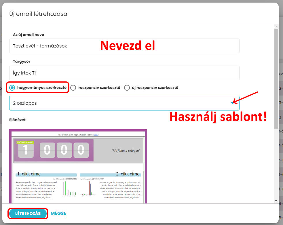 Ha kész vagy akkor kattints a Létrehozás gombra! A sablon kiválasztása után az Email szerkesztése oldalra jutsz. (A példában először a hagyományos szerkesztőt és sablon választottuk ki.)