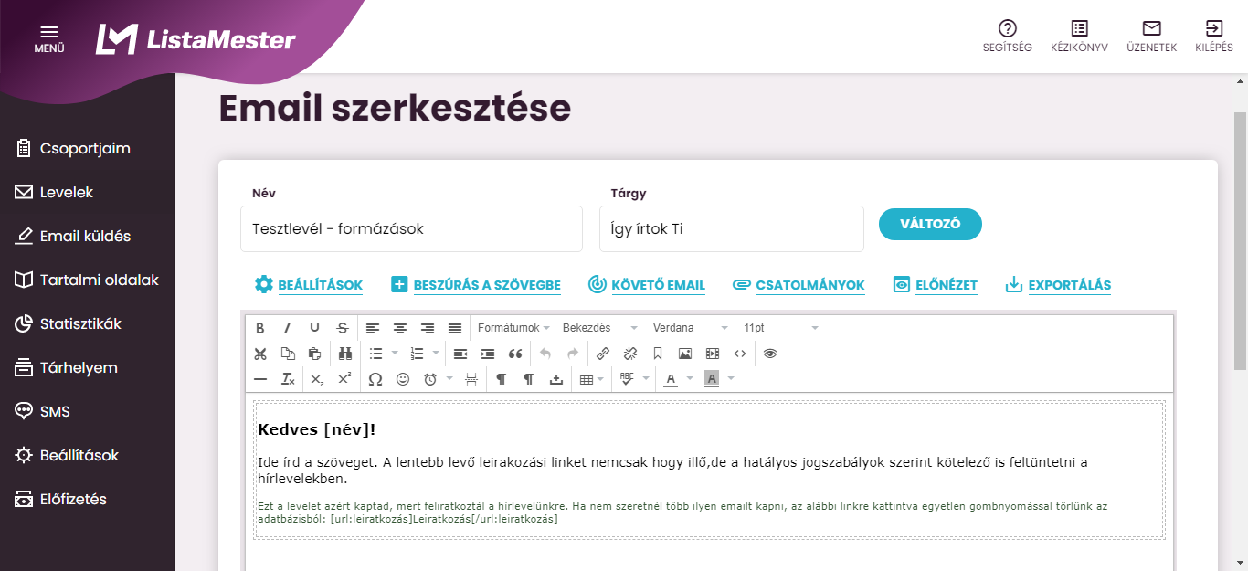 - Az új email neve: Ez az elnevezés csak belső használatra való, csak arra szolgál, hogy könnyű legyen rá hivatkozni a rendszerben. Ezzel a névvel tudsz a levélre hivatkozni, amikor pl. beállítod a kiküldést az Email küldés menüpontban, vagy összerakod a hírlevélsorozatot a Hírlevélsorozatok menüpontban. Tetszőlegesen elnevezheted, nem jelenik meg a hírleveledben, az olvasóid nem fognak találkozni ezzel az elnevezéssel. (az én példámban: Tesztlevél - formázások).