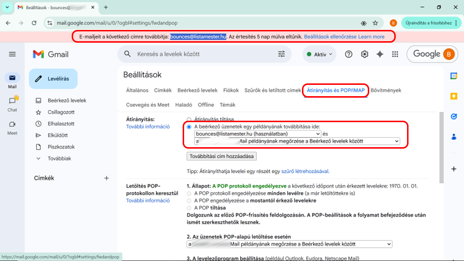 Az Átirányítás részben válaszd ki A beérkező üzenetek egy példányának továbbítása ide opciót, és add meg a bounces@listamester.hu címet.