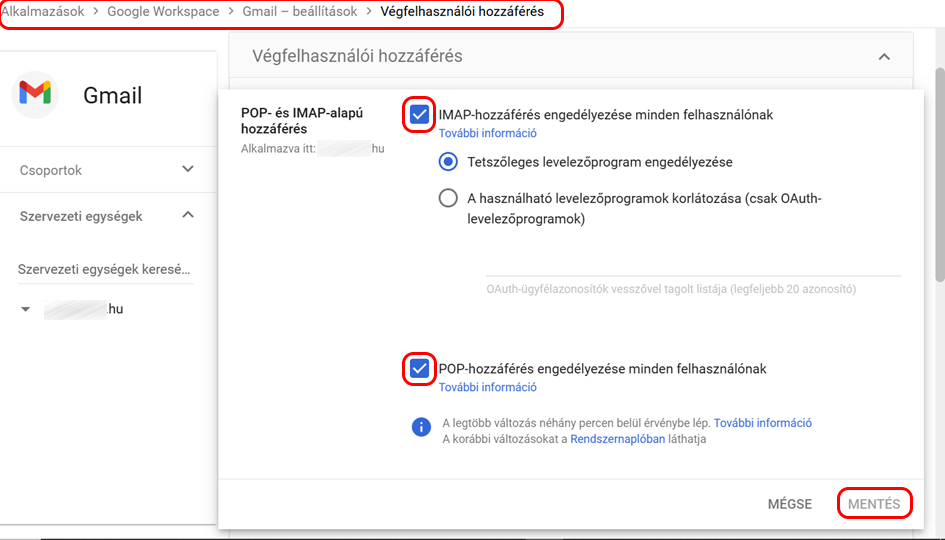 A Beállítások → Átirányítás és POP/IMAP menüben engedélyezd a POP-hozzáférést és az IMAP-hozzáférést, majd kattints a Mentés gombra.
