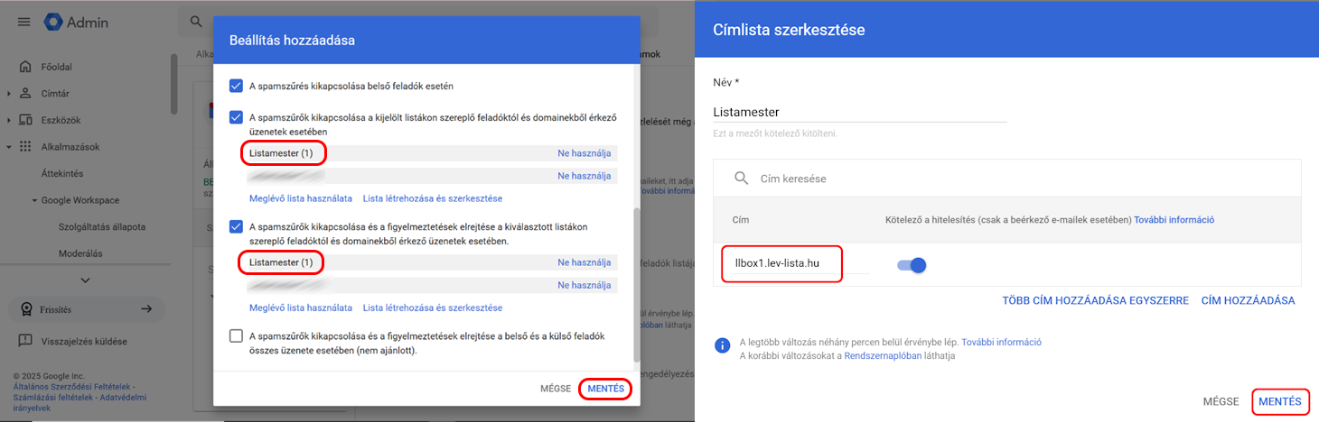 - Lépj be újra az Google Adminba, és válaszd ki az Alkalmazások - Google Workspace - Gmail - Spam, adathalászat és rosszindulatú programok - SPAM menüpontot. Itt rögzítened kell (konfigurálás) az usrdomains.listamester.hu domaint megbízható feladónak. (Ez a domain csak a tesztelés eseténben)