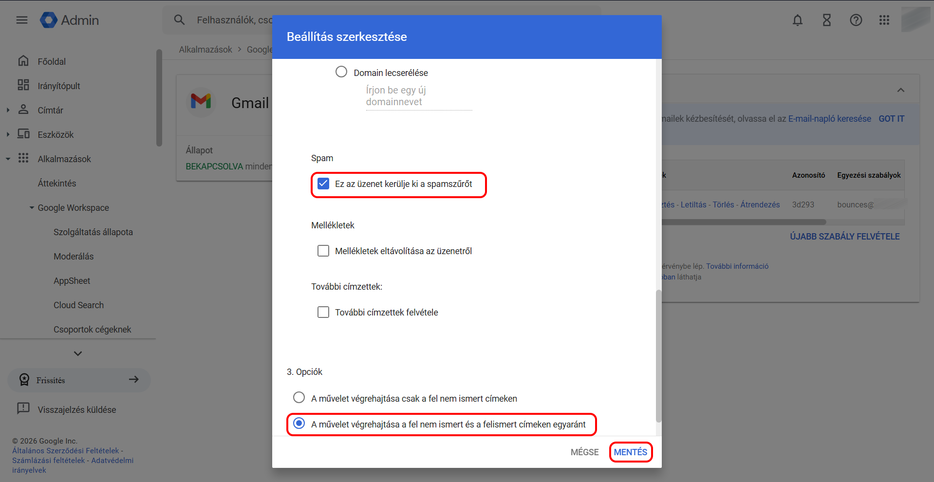 Az utolsó, 3. Opciók(Options) pontnál fontos, hogy válaszd A művelet végrehajtása a fel nem ismert és a felismert címeken egyaránt (Perform this action on non-recognised and recognised addresses) lehetőséget.