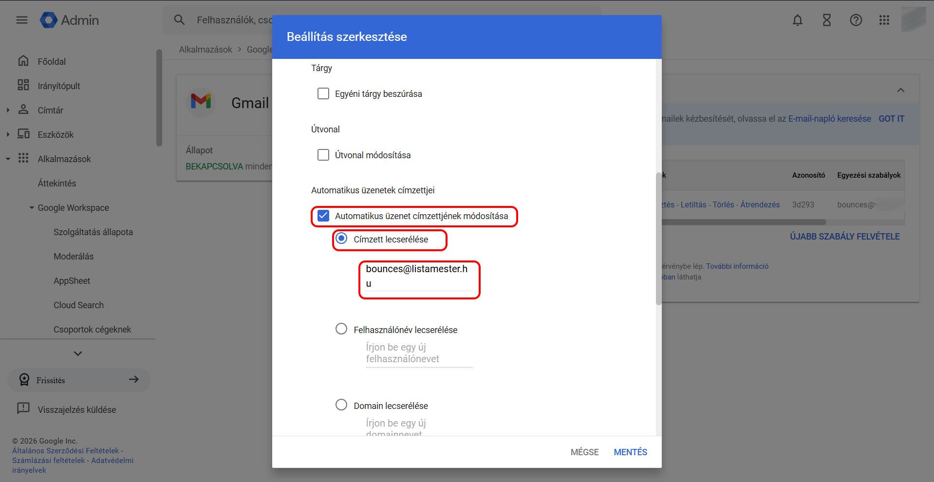 Görgess lejjebb és pipáld be a 2. pont alatti Automatikus üzenet címzettjének módosítása (Change envelope recipient) checkboxot, majd a Címzett lecserélése (Replace recipient) mezőbe írd be a bounces@listamester.hu címet.