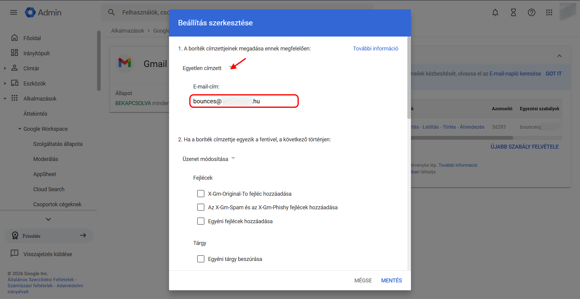 A beállítás első pontja alatt válaszd ki az Egyetlen címzett (Single recipient) opciót, és írd be a szövegmezőbe a létrehozandó bounce címet pl. bounces@cegesdomain.hu.