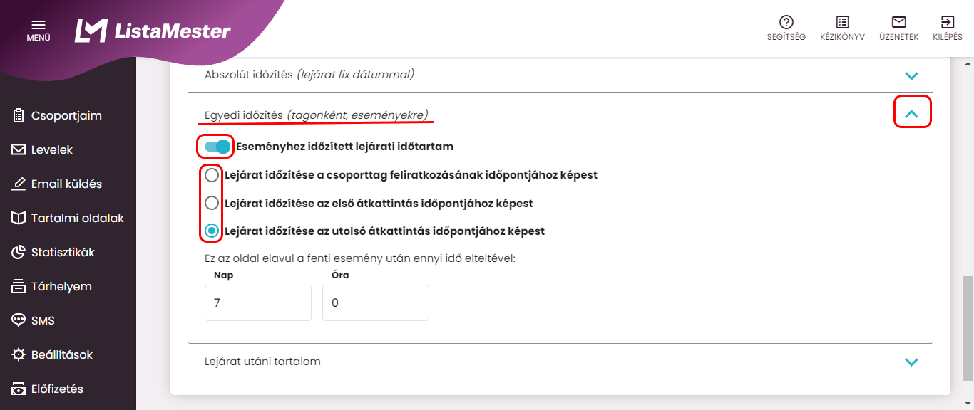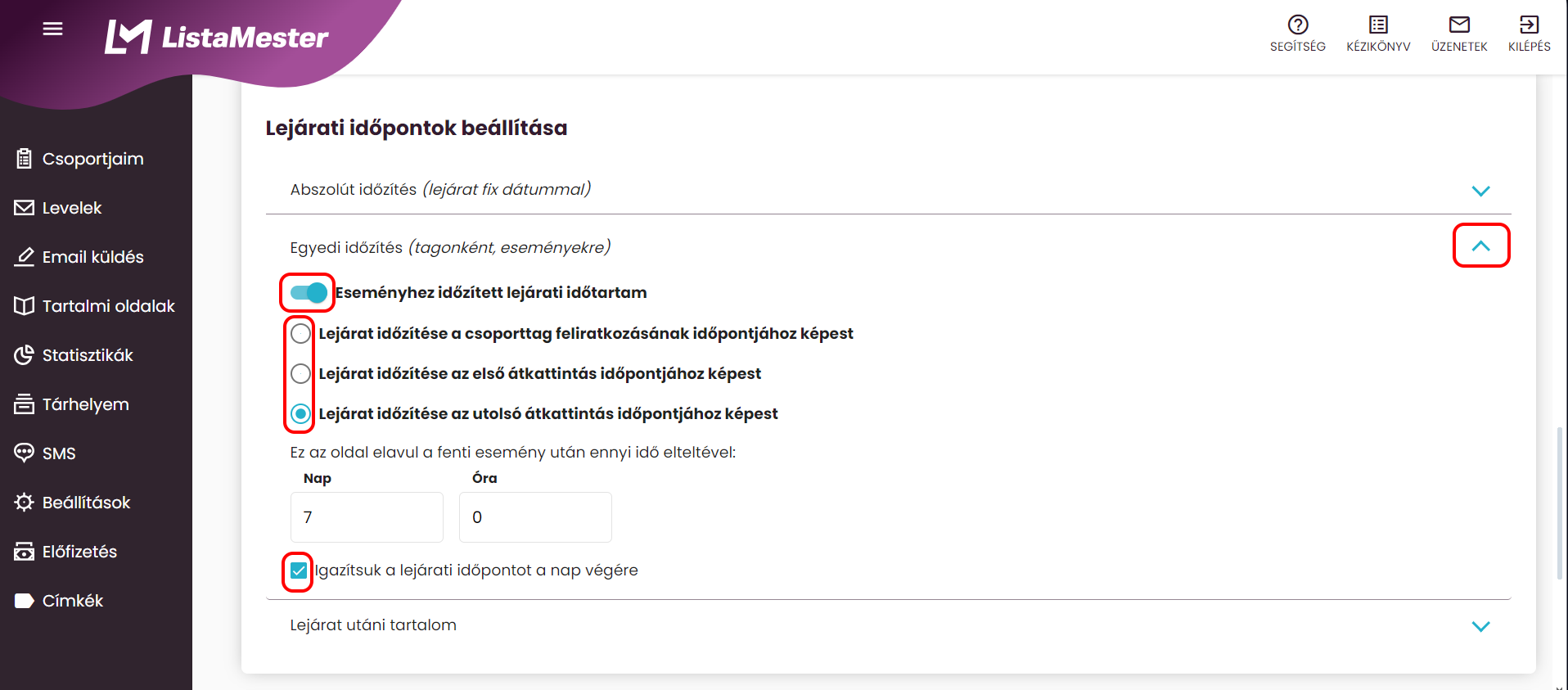 Azért, hogy az adott tartalmi oldal ne percre pontosan járjon le beállíthatod, hogy a lejárat idejét "Igazítsuk a lejárati időpontot a nap végére". Ehhez pipáld be a checkboxot! (Enélkül ha pl. a feliratkozási időponthoz képest jár le a tartalmi oldal, és a feliratkozás reggel 7-kor történt, akkor 7 nap múlva 7:01-kor már nem lenne elérhető a tart. oldal. A checkboxxal viszont a nap végéig még eléri a feliratkozó.)